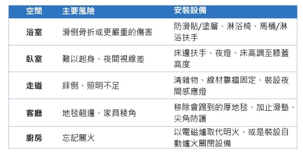 優先處理高風險點: 浴室、臥室、走道。