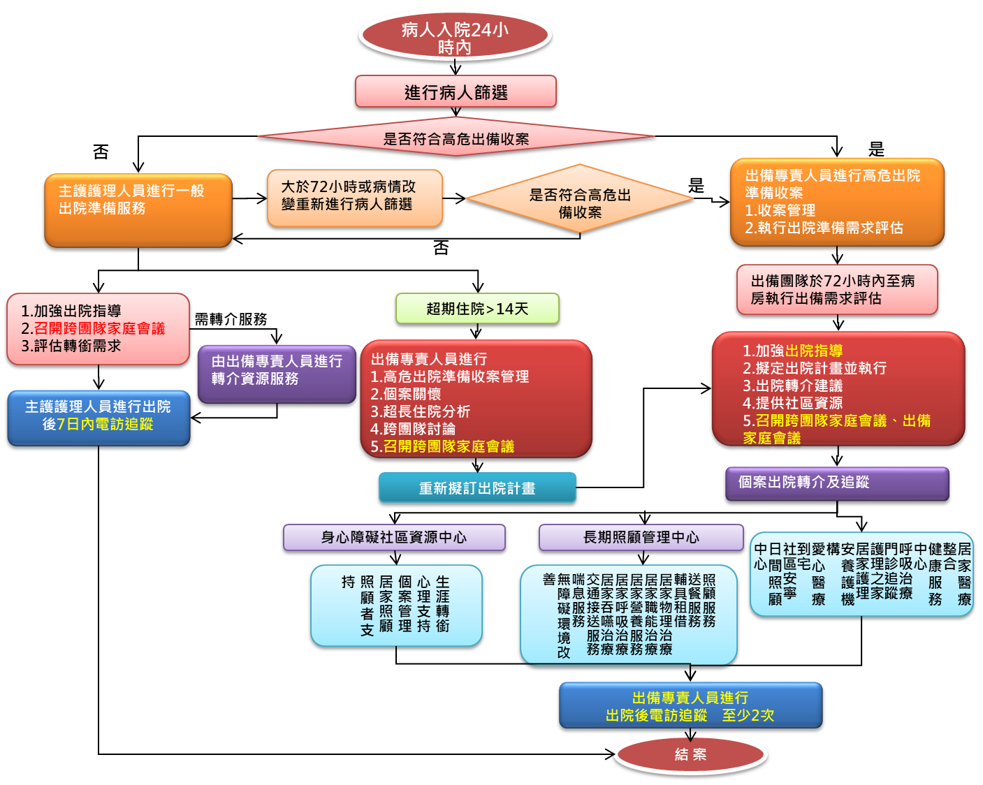 並非每個人都屬於高危險病患的出院準備,簡稱『高危出備』,且每家的醫院出院準備的標準及規範略有不同。以下流程圖可以協助您瞭解所謂出院準備的大致流程: