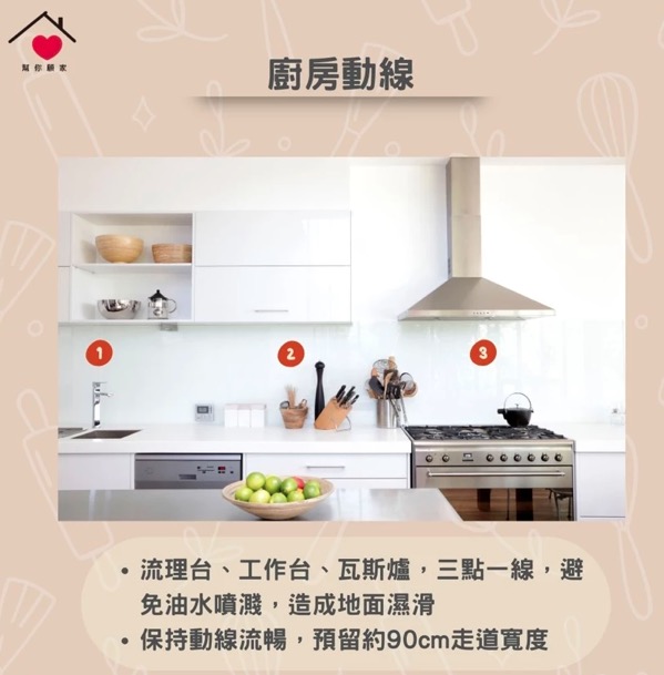 流理台與瓦斯爐建議降至80~85公分,減少前傾拉扯行為導致失衡。廚房地板避免濕滑材質,建議加鋪止滑軟墊。轉角區域設立短扶手,有助穩定行進中平衡。
