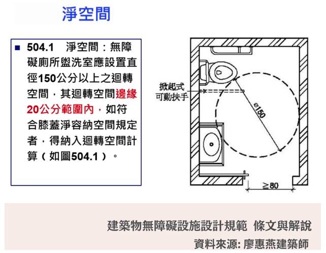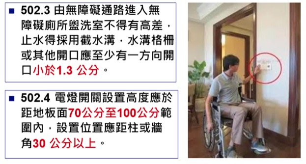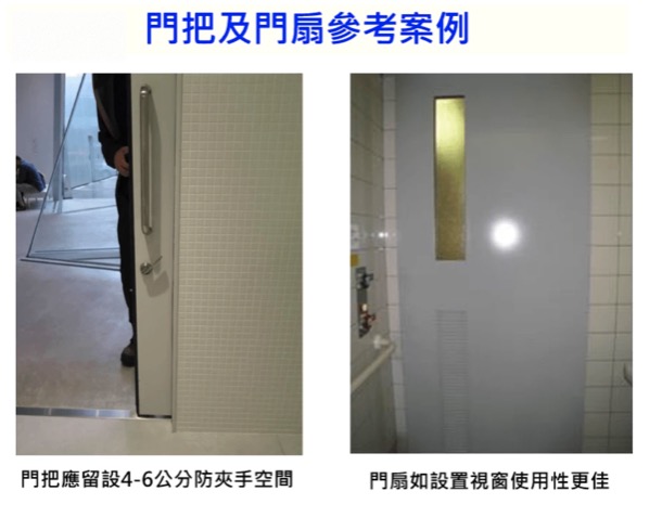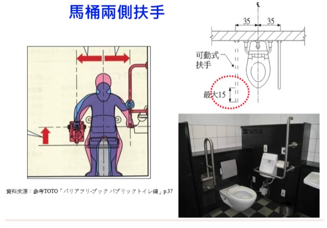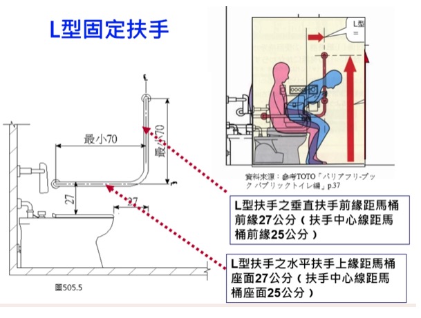支撐設施:於馬桶、淋浴區、洗手台裝設L型或垂直扶手