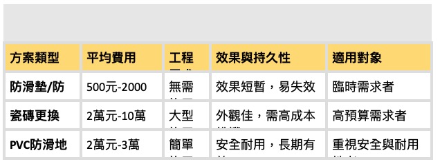 - 防滑墊或貼片的初期成本低,但耐用性有限,經常需要更換。